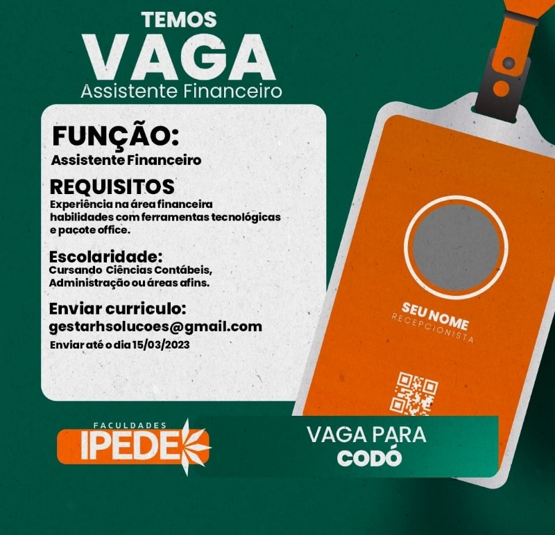 A Faculdade IPEDE esta contratando Assistente Financeiro interessados enviar currículo para gestarhsolucoes@gmail.com