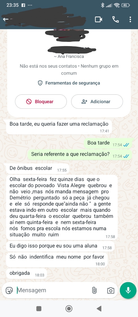 Olha sexta-feira fez quinze dias que o escolar do povoado Vista Alegre quebrou e não veio ,mas nós manda mensagem pro Demétrio perguntado só a peça já chegou e ele só responde que”ainda não ” a gente estava indo em outro escolar mais quando deu quarta-feira o escolar quebrou também aí nem quinta-feira e nem sexta-feira nós fomos pra escola nós estamos numa situação muito ruim