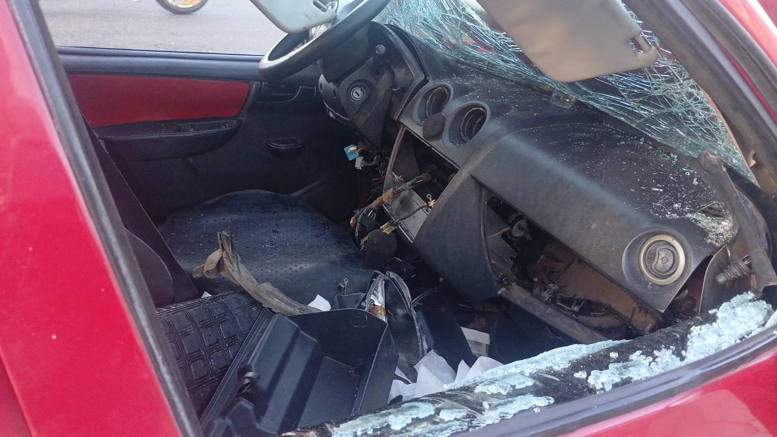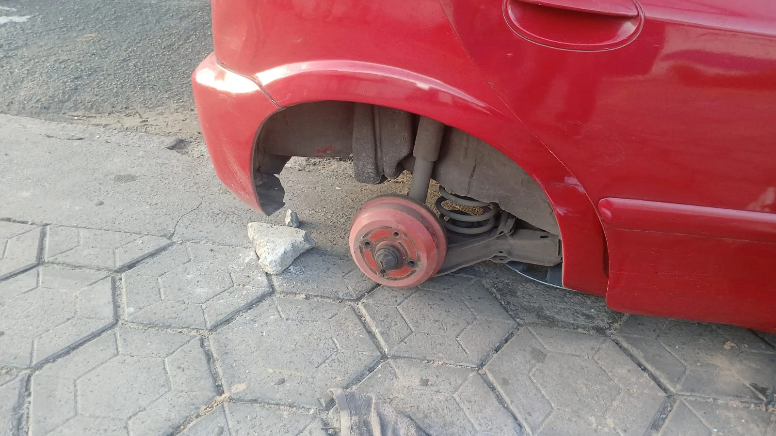 O condutor descobriu que criminosos roubaram peças do carro. Eles levaram as rodas traseiras e retiraram itens do interior, como som, bateria e outros objetos.