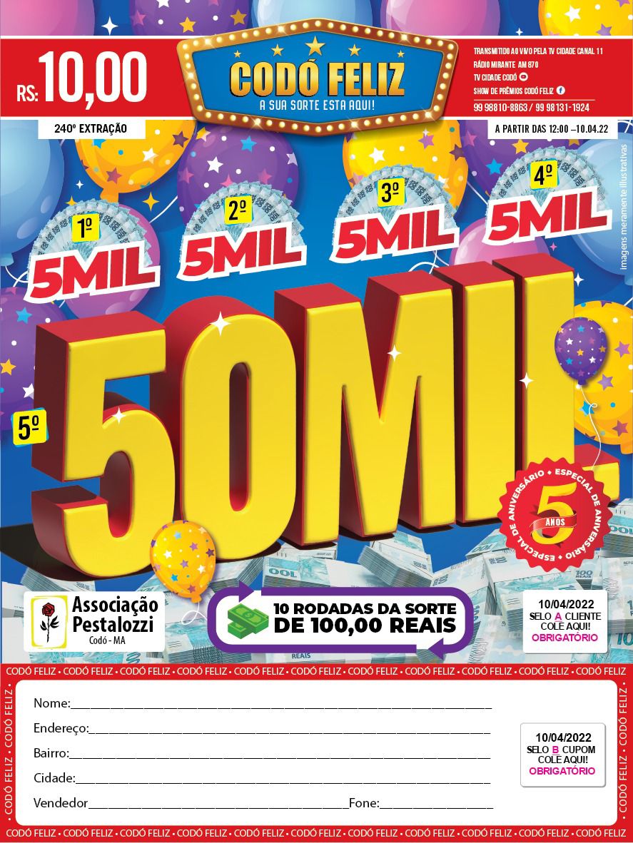 Codo Feliz de Aniversário vai pagar a maior premiação da história O Codo Feliz de Aniversário desta semana com edição celebra os 5º anos e para comemorar, serão pagos mais de R$ 7 1 mil em dinheiro, sendo a maior quantia da história do Codo Feliz.