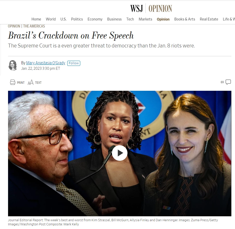 A colunista Mary Anastasia O’Grady, do jornal norte-americano The Wall Street Journal, defendeu, em artigo publicado neste domingo (22), que o Supremo Tribunal Federal (STF) representa uma ameaça ainda maior à democracia que a invasão às sedes dos Três Poderes, em 8 de janeiro. No texto, a jornalista versa sobre seu receio com a “repressão do Brasil à liberdade de expressão”.
