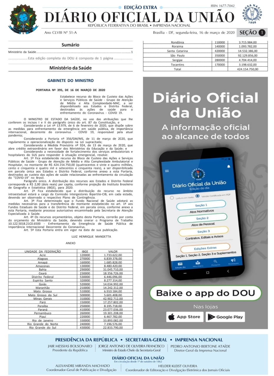 Foi publicada na edição extra do Diário Oficial do Maranhão desta segunda-feira (16), a Portaria 395/2020, que estabelece recursos para ações de enfrentamento da crise de saúde pública provocada pelo novo coronavírus. De acordo com o Ministério da Saúde, o Maranhão vai receber R$ 14,2 milhões do Governo Federal para ações emergenciais de combate e prevenção ao covid-19.