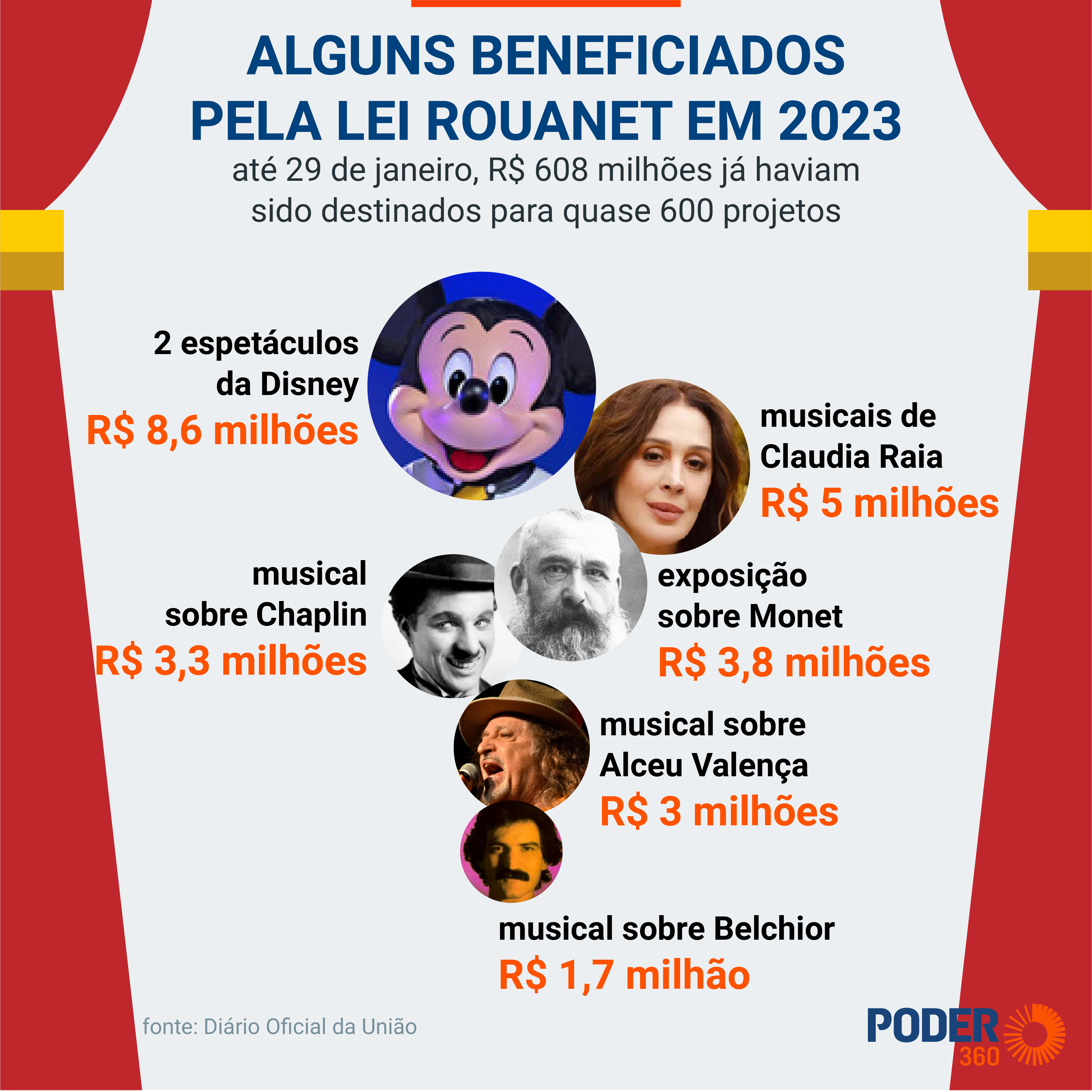 Até domingo (29.jan.2023), o governo do presidente Luiz Inácio Lula da Silva (PT) publicou 595 projetos culturais aprovados pela Lei Rouanet (Lei 8.313/1991), somando R$ 608 milhões para a sua execução. A lei permite que empresas e cidadãos que apoiem ações culturais deduzam parte do Imposto de Renda e destinem o valor às propostas.