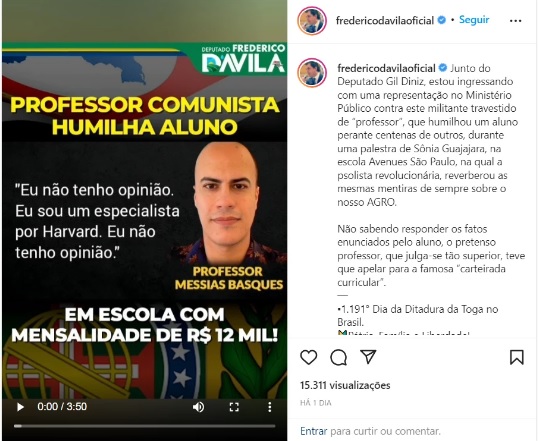 – Junto do Deputado Gil Diniz, estou ingressando com uma representação no Ministério Público contra este militante travestido de “professor”, que humilhou um aluno perante centenas de outros, durante uma palestra de Sônia Guajajara, na escola Avenues São Paulo, na qual a psolista revolucionária, reverberou as mesmas mentiras de sempre sobre o nosso AGRO. Não sabendo responder os fatos enunciados pelo aluno, o pretenso professor, que julga-se tão superior, teve que apelar para a famosa “carteirada curricular” – escreveu Frederico d’Avila, no Instagram.