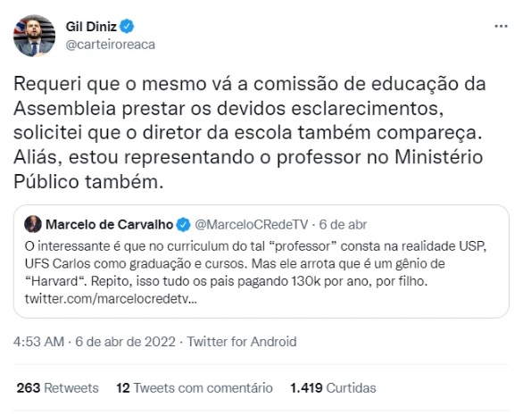 – Requeri que o mesmo vá a comissão de educação da Assembleia prestar os devidos esclarecimentos, solicitei que o diretor da escola também compareça. Aliás, estou representando o professor no Ministério Público também – apontou Gil Diniz, no Twitter.