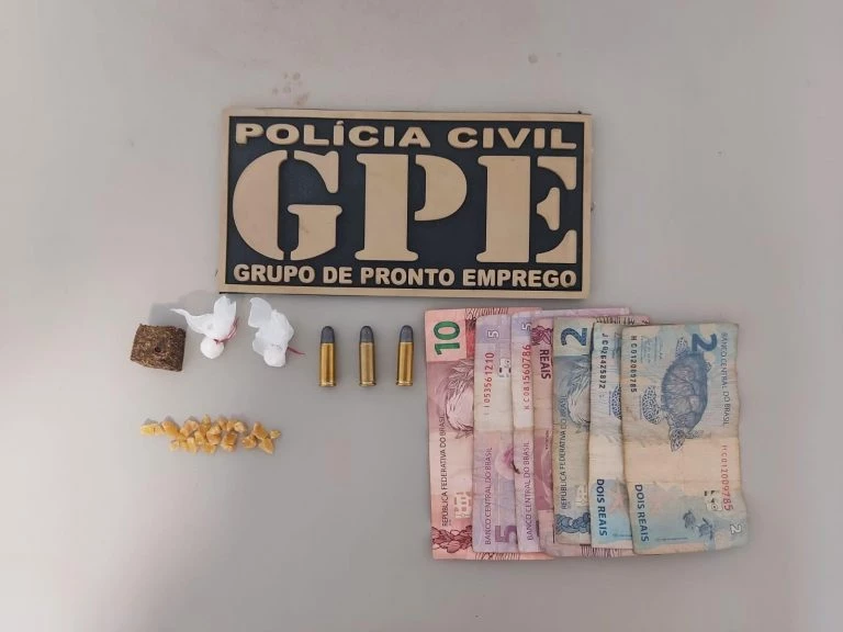 Durante a busca, foram encontradas porções de crack, cocaína e maconha, além de dinheiro trocado, material para embalo de entorpecentes e munições de calibre 22. O homem foi autuado em flagrante por tráfico de drogas e posse ilegal de munição.
