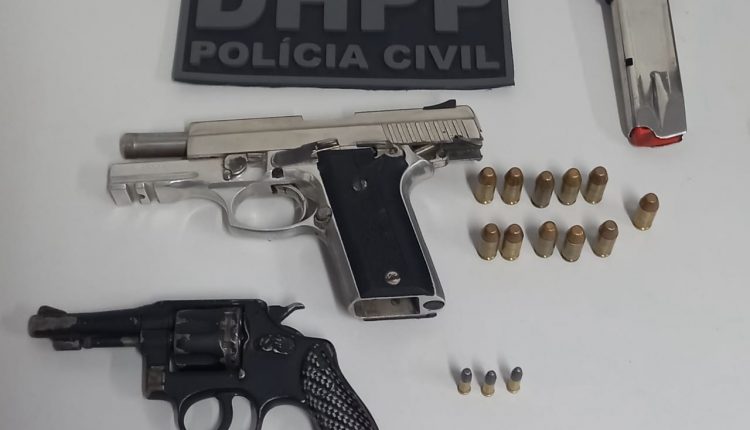 Ao averiguar a situação, foi localizado duas armas de fogo com um dos suspeitos, sendo uma pistola calibre .40 e um revólver calibre .22, ambos carregados. Já com o outro criminoso foi encontrado a chave do veículo roubado.