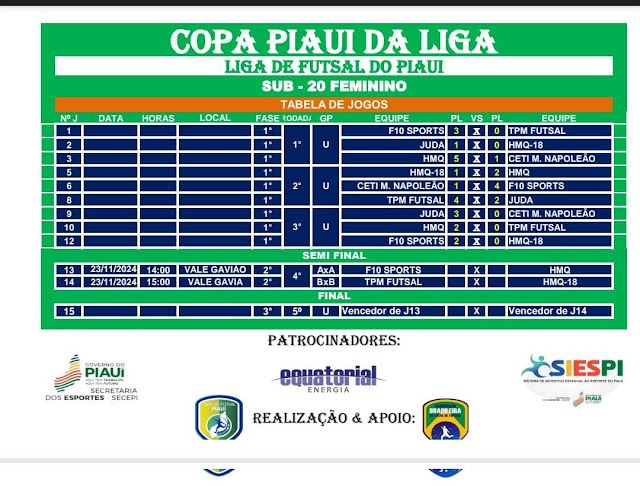 O primeiro compromisso é pelas semifinais da Copa Piauí de Futsal Feminino sub 20, contra a fortíssima equipe HMQ. As duas equipes venceram seus três adversários da primeira fase em setembro, tendo o F10 Sports os seguintes resultados: 4×1 no CETI, 3×0 no TPM e 2×0 no HMQ18. Veja abaixo a tabela: