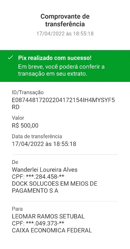 Em seguida, Setubal tranquiliza Alves sobre o momento em que tivesse que passar pelo visto do lado paraense. “Aí você vai embora e fala com ele (fiscal do Pará), sem problema nenhum. Entrega suas notas normalmente”, disse. O caminhoneiro foi orientado a realizar o pagamento da propina pelo PIX. Segundo o comprovante, o destino dos 500 reais foi a própria conta do agente fiscal. Veja o comprovante da transferência logo abaixo: