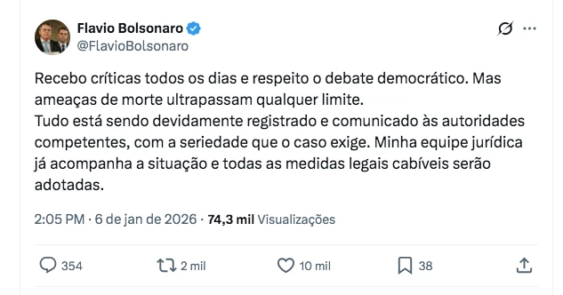 Nesta terça-feira (6), o senador e pré-candidato à Presidência, Flávio Bolsonaro (PL-RJ), usou as redes sociais para revelar que recebeu ameaças de morte. Ele destacou que “tudo está sendo devidamente registrado e comunicado às autoridades competentes”.