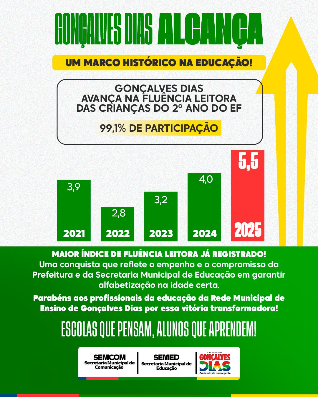 “Estamos vivenciando um capítulo histórico na educação de Gonçalves Dias. Há muito a comemorar. Esse resultado é fruto do trabalho, da dedicação e do compromisso de toda a gestão municipal. Não existe notícia melhor para o início do ano letivo do que ver o resultado do nosso trabalho sendo exitoso. Seguimos firmes, trabalhando para avançar ainda mais e garantir um futuro melhor para nossas crianças”, afirmou a prefeita.