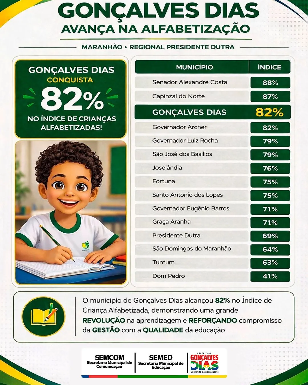 Os dados do Indicador de Criança Alfabetizada (ICA), divulgados pelo Instituto Nacional de Estudos e Pesquisas Educacionais Anísio Teixeira (Inep), que mede o percentual de crianças alfabetizadas na idade certa, mostram que Gonçalves Dias com 82% em 2025.