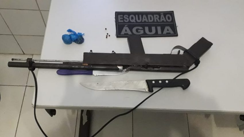 Por volta das 20:30min da noite deste sábado, 08/06, policiais do Esquadrão Águia do 17° BPM, durante rondas de rotina pelo bairro São Francisco, avistaram um elemento portando uma arma de fabricação artesanal (garruncha), que ao perceber a presença dos policiais ainda tentou se desfazer da arma correndo sentido o beco de um residência, sendo alcançado e detido. O acusado alegou que o motivo de andar armado seria para se defender de rivais que o ameaçam de morte. Com permissão do acusado Lucas Lima da Silva, 18, anos que reside na Presidente José Sarney, São Francisco, a guarnição adentrou em sua residência e durante buscas foram localizados munição (espoleta, chumbo e pólvora) utilizados para recarregar a arma.