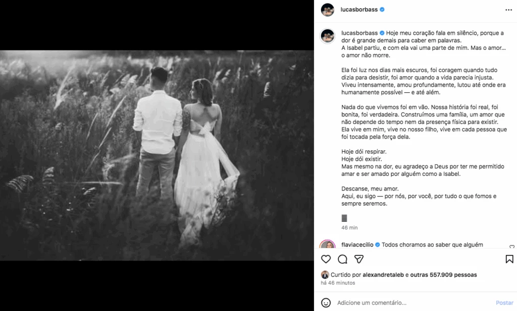 – Hoje meu coração fala em silêncio, porque a dor é grande demais para caber em palavras. A Isabel partiu, e com ela vai uma parte de mim. Mas o amor… o amor não morre. Ela foi luz nos dias mais escuros, foi coragem quando tudo dizia para desistir, foi amor quando a vida parecia injusta. Viveu intensamente, amou profundamente, lutou até onde era humanamente possível — e até além. Nada do que vivemos foi em vão. Nossa história foi real, foi bonita, foi verdadeira. Construímos uma família, um amor que não depende do tempo nem da presença física para existir. Ela vive em mim, vive no nosso filho, vive em cada pessoa que foi tocada pela força dela. Hoje dói respirar. Hoje dói existir. Mas mesmo na dor, eu agradeço a Deus por ter me permitido amar e ser amado por alguém como a Isabel. Descanse, meu amor. Aqui, eu sigo — por nós, por você, por tudo o que fomos e sempre seremos – escreveu Lucas, no Instagram.