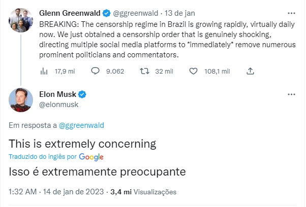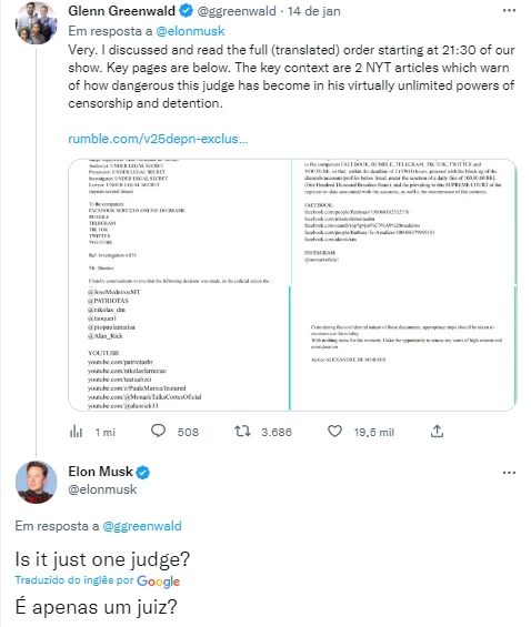 Após ser respondido por Greenwald com trechos traduzidos da decisão de Moraes que restringiu o acesso no Brasil aos perfis das redes sociais de influenciadores e políticos, como o deputado eleito Nikolas Ferreira (PL-MG) e o youtuber Monark, Musk ainda questionou o jornalista se apenas um juiz teria decidido sobre os bloqueios.