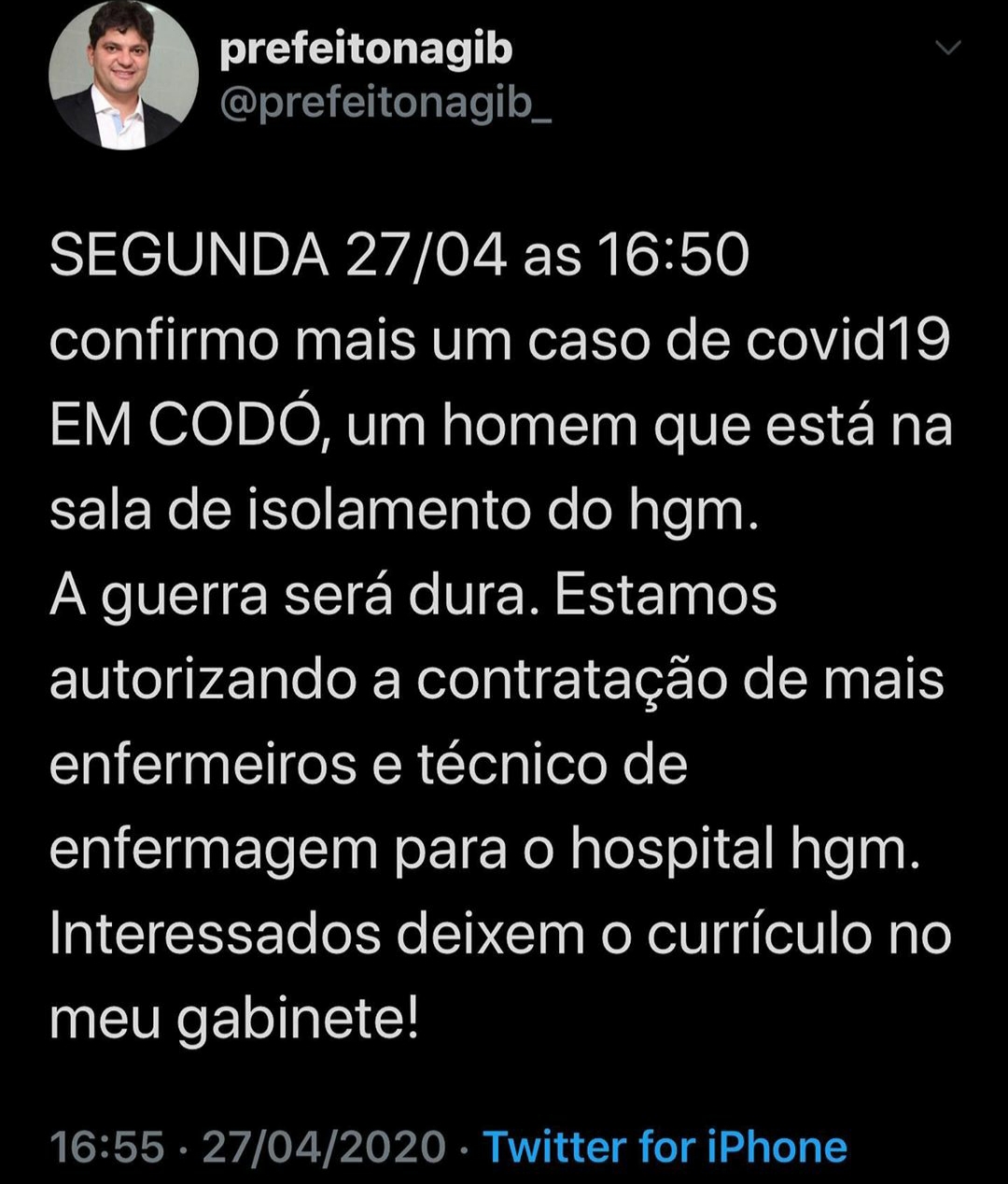 O prefeito de Codó, FFrancisco Nagib (PDT),divulgou em suas redes sociais no início desta noite de segunda-feira (27) que ele e a primeira dama estão em isolamento domiciliar com sintomas do coronavírus.