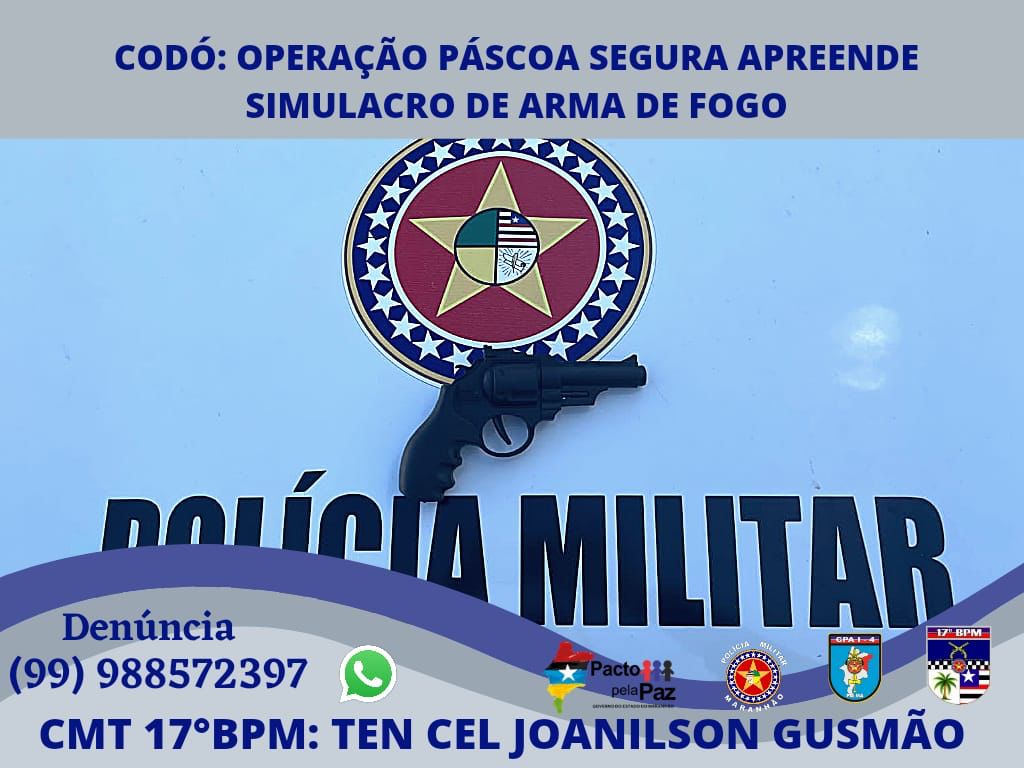 Na tarde desta quinta-feira (14), policiais militares do 17º BPM faziam rondas pela estrada vicinal que liga o bairro Codó Novo ao Residencial São Pedro quando avistou dois indivíduos trafegando naquela área. Os militares realizaram a abordagem e na revista pessoal foi localizado um simulacro de um revólver.