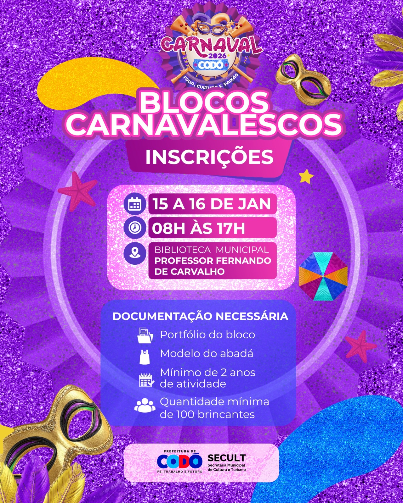A Prefeitura de Codó, por meio da Secretaria Municipal de Cultura e Turismo, dará início, a partir desta terça-feira (13), às inscrições para Blocos Carnavalescos e Barraqueiros interessados em participar do Carnaval 2026. A iniciativa visa garantir organização, segurança e oportunidade para todos que desejam integrar a maior festa popular do município.