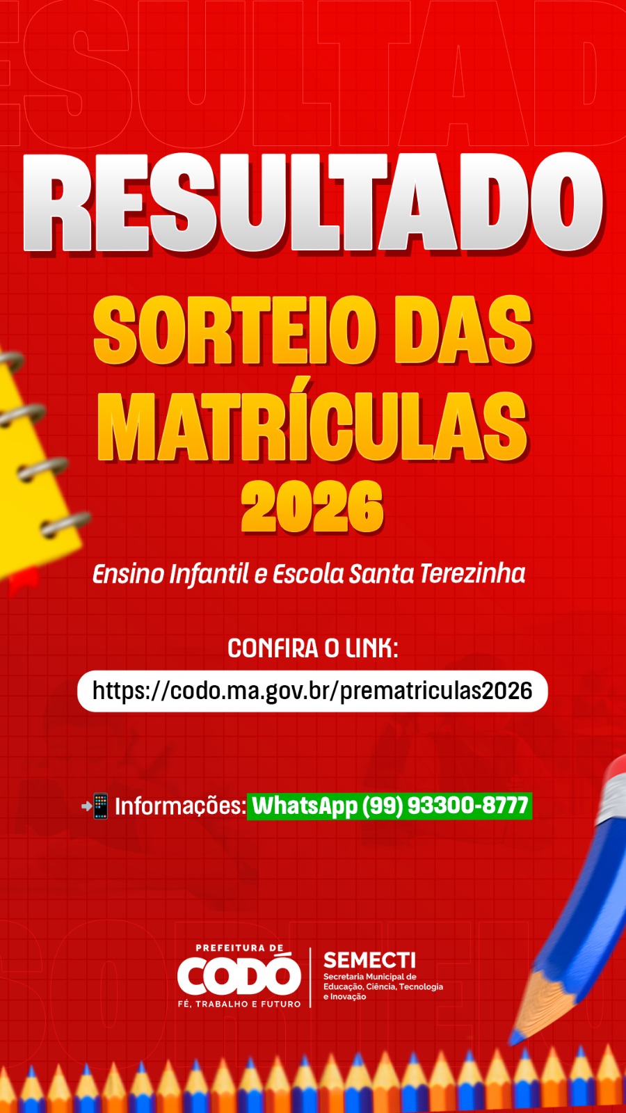 A Prefeitura de Codó, por meio da Secretaria Municipal de Educação, Ciência, Tecnologia e Inovação (SEMECTI), divulgou o resultado do sorteio público para seleção de novos alunos candidatos à pré-matrícula da Educação Infantil da rede municipal de ensino e da Escola Santa Terezinha para o ano letivo de 2026.