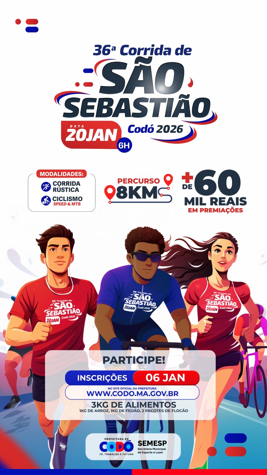 A Prefeitura de Codó, por meio da Secretaria Municipal de Esporte e Lazer (SEMESP), realiza a 36ª edição da tradicional Corrida de São Sebastião, um dos maiores e mais aguardados eventos esportivos do município. A competição acontecerá no dia 20 de janeiro de 2026, reunindo atletas de diversos estados em uma grande celebração do esporte, da fé, da superação e da solidariedade.