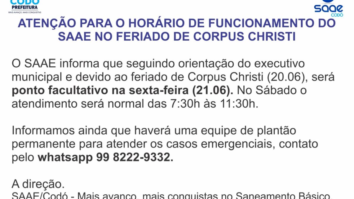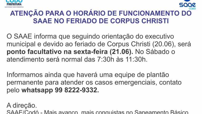 O SAAE informa que seguindo orientação do executivo municipal e devido ao feriado de Corpus Christi (20.06), será ponto facultativo na sexta-feira (21.06). No Sábado o atendimento será normal das 7:30h às 11:30h.