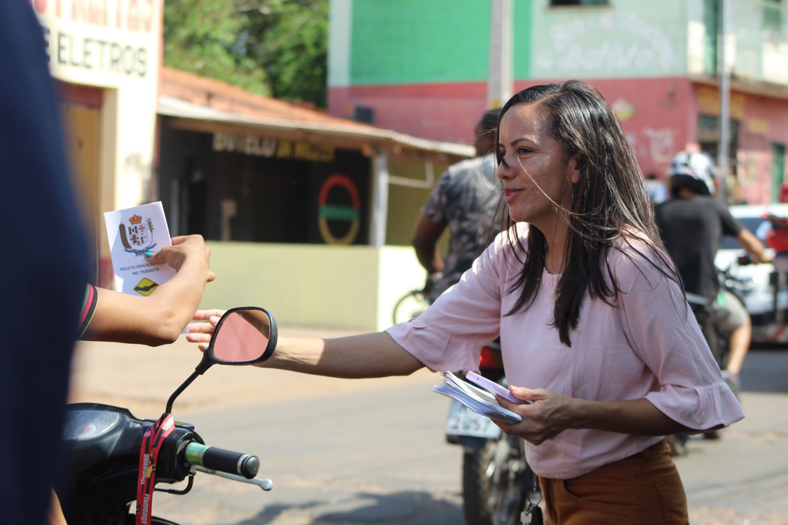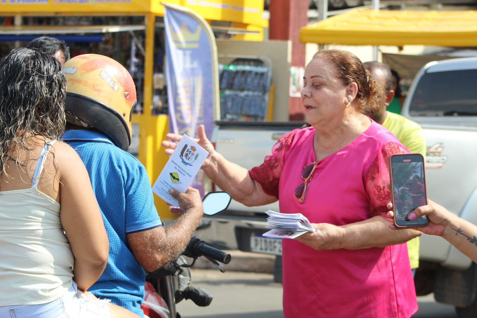 A Secretária de Assistência Social, Eliane Figueiredo, acompanhou aos voluntários que abordavam os veículos e transeuntes, na distribuição de panfletos educativos com informações para segurança no trânsito, como direção segura, velocidade dentro dos limites sinalizados, uso de equipamentos para motociclistas, e dicas para segurança de condutores e pedestres.