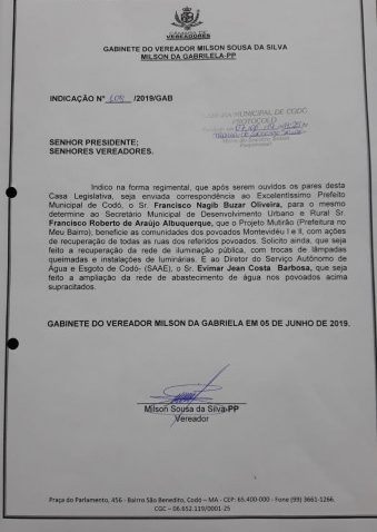 Vereador Milson da Gabriela na Sessão Ordinária desta terça-feira (11/06), através de sua indicação pede que o Projeto Mutirão (Prefeitura no meu Bairro) benefície as comunidades dos povoados *Montevidéu l e ll*, com ações de recuperação de todas as ruas dos referidos povoados, e também a recuperação da rede de iluminação pública. Solicitou ainda, ao diretor do SAAE que seja feito a ampliação da rede de abastecimento de água.